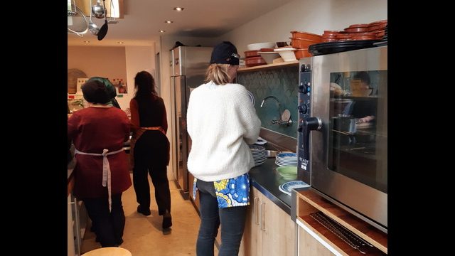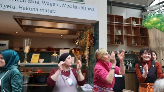 We werden verwelkomd door een aantal enthousiaste vrouwen in een heerlijk warme omgeving. Er klonk mooie muziek op de achtergrond. De lange tafel was vrolijk gedekt voor 30 personen. Er was een open keuken en het rook er heerlijk. De middag begon met een lied wat door alle vrouwen van de wereldkeuken werd meegezongen. Het refrein stond op de keukenmuur zodat wij ook mee konden zingen en klappen. Alle vrouwen waren mooi gekleed en hadden kleurige eigen gemaakte schorten aan.
